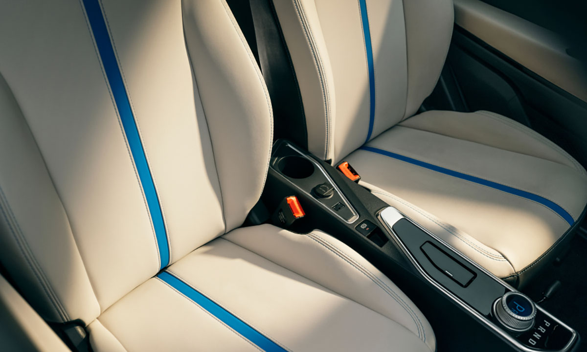 Im Interieur des Dyo fallen zunächst die eleganten Sitze aus veganem und atmungsaktivem Leder auf. Die Kombination aus weißem Bezug und einer blauen Ziernaht verleiht dem Innenraum einen hochwertigen Eindruck. In der Mittelkonsole prangt ein 12,3-Zoll-Touchscreen, über den sich das Android-Betriebssystem steuern lässt.