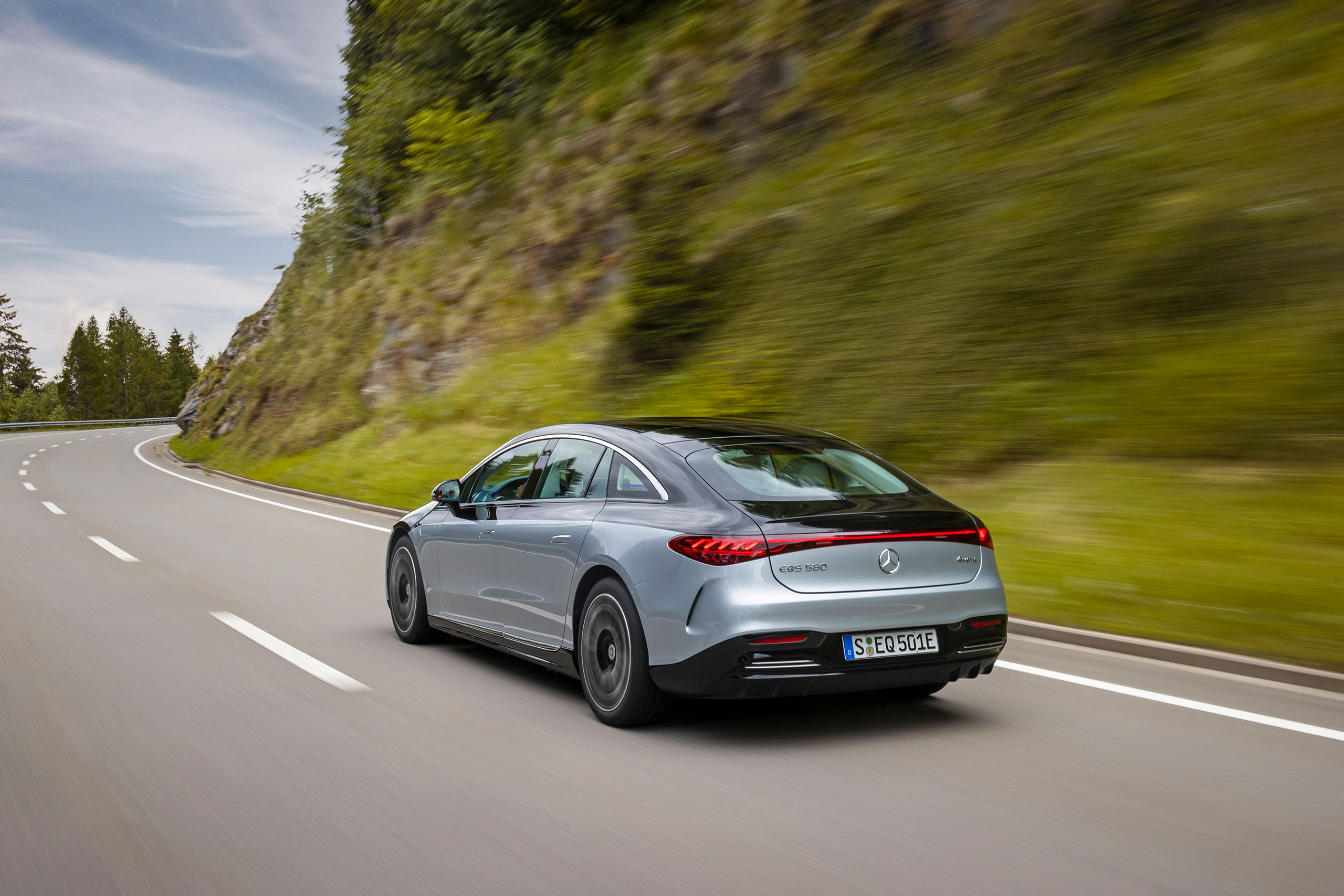 Noch sportlicher geht es im EQS 580 4MATIC zur Sache. Wer keinen AMG, aber dennoch ein leistungsstarkes Elektroauto mit Stern fahren möchte, ist mit dem 580 bestens bedient. Angetrieben wird der EQS von zwei Elektromotoren, die insgesamt 523 PS über alle vier Räder auf die Straße bringen. Mit beachtlichen 855 Nm Drehmoment stehen die 100 km/h bereits nach 4,3 Sekunden auf der Uhr. Der kombinierte Stromverbrauch liegt bei 18,5 kWh auf 100 Kilometer. Dank seiner Reichweite von bis zu 670 Kilometern ist der Mercedes-Benz EQS 580 der perfekte Begleiter für lange Strecken.