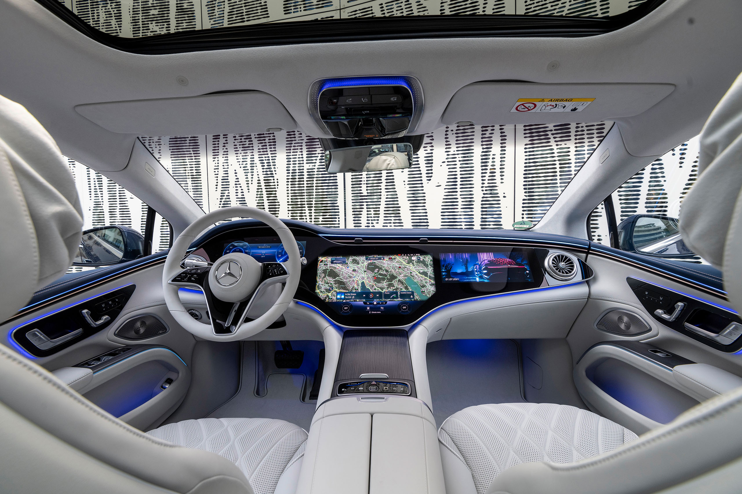 Ein echter Hingucker und ein technisches Highlight ist der MBUX Hyperscreen. Dieser vereint das digitale Kombiinstrument, das Infotainmentsystem und das Beifahrerdisplay unter einer geschwungenen Glasfläche. Dank der künstlichen Intelligenz lernt das System die Vorlieben des Fahrers kennen und schlägt ihm je nach Anlass passende Bedienschritte vor. Zu Beginn gibt es den EQS nicht nur in der Serienausstattung, sondern auch als Sondermodell Edition 1. Diese zeichnet sich durch die sportliche AMG-Line, 21-Zoll-Leichmetallräder, Nussbaum-Zierelemente, ein Panorama-Schiebedach und Multikontursitze aus.