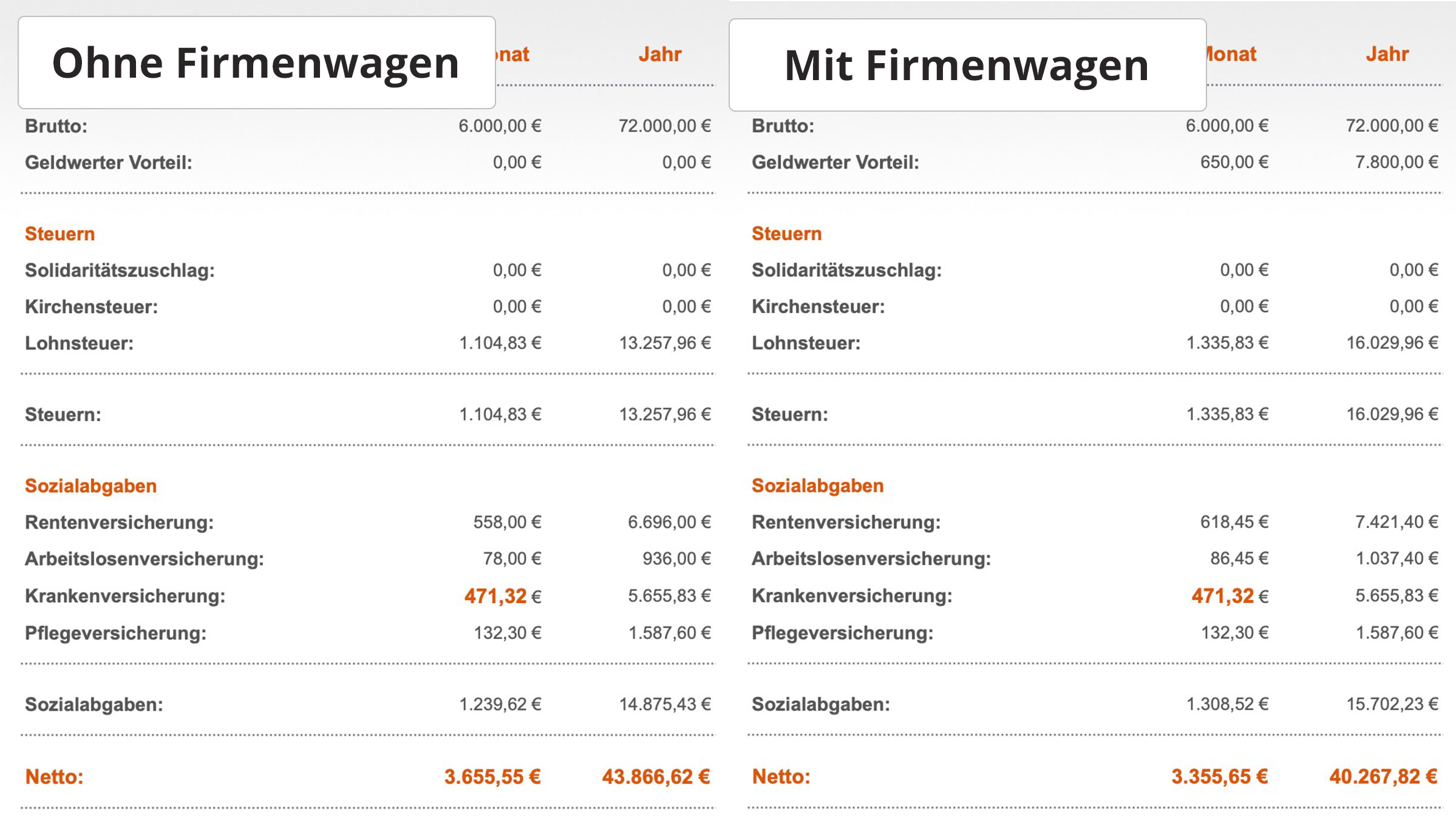 Da tendenziell Arbeitnehmer mit höherem Einkommen einen Firmenwagen bereitgestellt bekommen, haben wir ein Gehalt weit über dem Schnitt angenommen. Wichtig zu verstehen ist noch, dass nicht nur Steuern sondern auch Sozialabgaben auf den geldwerten Vorteil anfallen sofern die Beitragsbemessungsgrenzen noch nicht erreicht wurden für die jeweiligen Sozialversicherungen.