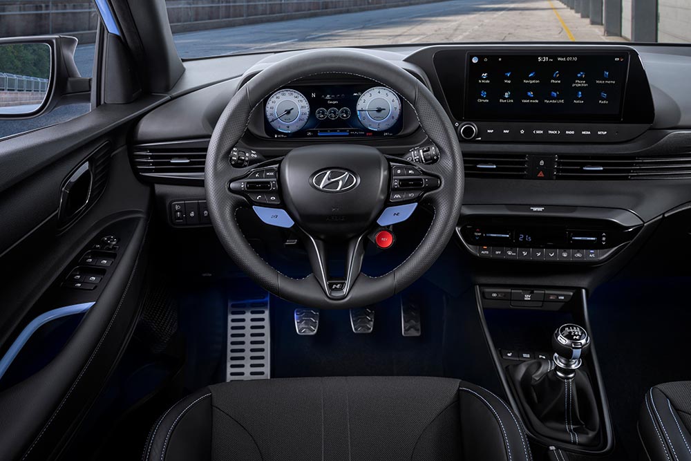 Ebenso sportlich geht es im Innenraum des kraftvollen Hyundais weiter. Auf den ersten Blick fällt sofort das N-spezifische Interieur auf, dessen schwarzer Innenraum mit blauen Designelemente akzentuiert wird. Hinter dem schicken N-Lenkrad blickt der Fahrer auf ein digitales Cockpit, das ihm alle wichtigen Funktionen, wie z.B. den perfekten Schaltzeitpunkt, anzeigt. Platz nimmt man auf Sportsitzen mit integrierten Kopfstützen. Komplettiert wird das sportliche Interieur durch einen Schaltknauf und Pedale in Aluminiumoptik.