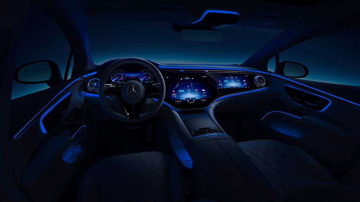 Insbesondere, wenn es draußen dunkel wird, illuminiert das dynamische Ambientelicht den Innenraum des EQS auf einzigartige Weise. So geben die über 190 LEDs dem Fahrer Rückmeldung zum Fahrbetrieb, etwa beim Boosten oder beim Rekuperieren. Des Weiteren ist das Ambientelicht an die Assistenzsysteme gekoppelt, sodass Warnhinweise optisch verstärkt werden.