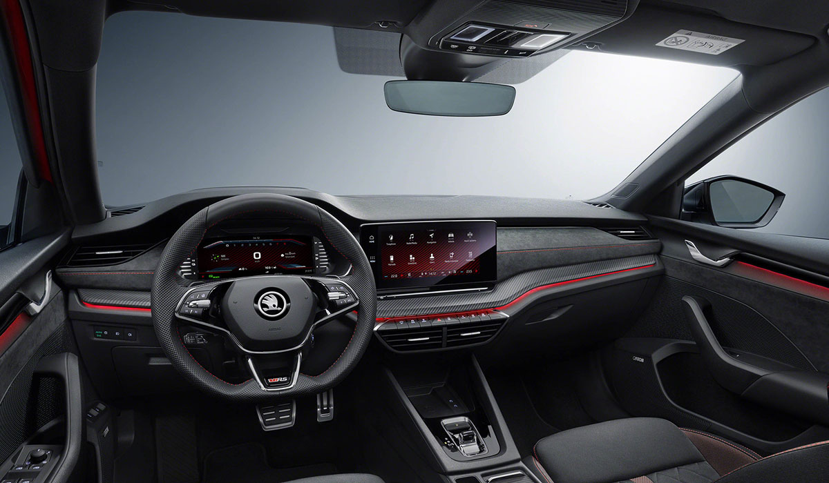 Hinter dem Lenkrad blickt der Fahrer auf das digitale Cockpit, das bereits aus den anderen neuen Octavia-Modellen bekannt ist, aber über modellspezifische Anpassungen verfügt. Die Online- und Konnektivitäts-Funktionen, die den Skoda Octavia RS iV moderner denn je machen, stammen ebenfalls aus dem „normalen“ Octavia.