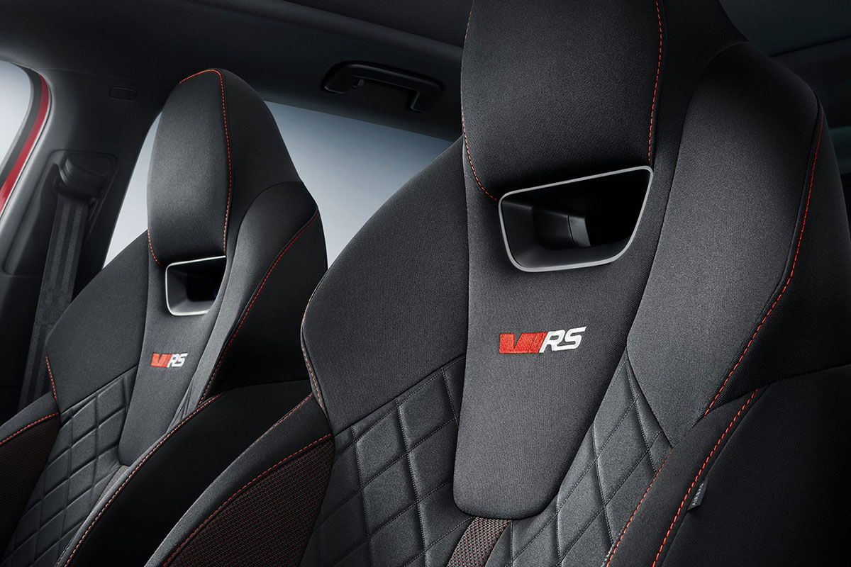 Im Innenraum fallen sofort die neuen Sportsitze mit integrierter Kopfstütze auf, die in der Standardkonfiguration mit Stoff bezogen sind und über farblich abgesetzt Kontrastnähte verfügen. Gegen Aufpreis gibt es Ergonomie-Sitze mit Leder – oder Alcantarabezug. Das schwarze Dreispeichenlenkrad ist unten abgeflacht und trägt das RS-Logo.